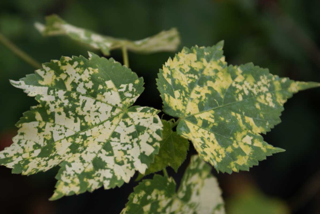 Abutilion pictum: Yeşil parçalı yapraklı, çiçekleri turuncu renkte olan bir türdür. Bu türün alacalı yapraklı olanı Abutilion pictum “Thompsonii veya Abutilion pictum variegata olarak bilinmektedir. Alacalı (variegata) görünümü oluşturan, Fasulye Cüce Mozaik Virüsüdür (Bean dwarf mosaic virus). Hasta olan yapraklar, virüsün kloroz (sarılık) a neden olmasına bağlı olarak, sarı-yeşil mozaik görünümündedir. Bol güneşte sarı renk daha öne çıkar. Göze hoş göründüğü için virüslü olan bu hastalıklı bitki, kültürde sağlam olanlara göre daha fazla kullanılmaktadır. Çelikle yapılan üretimde, virüslü bitki üretilmektedir, tohumlu üretim arzu edilirse, virüssüz normal yeşil yapraklı bitki elde edilir.