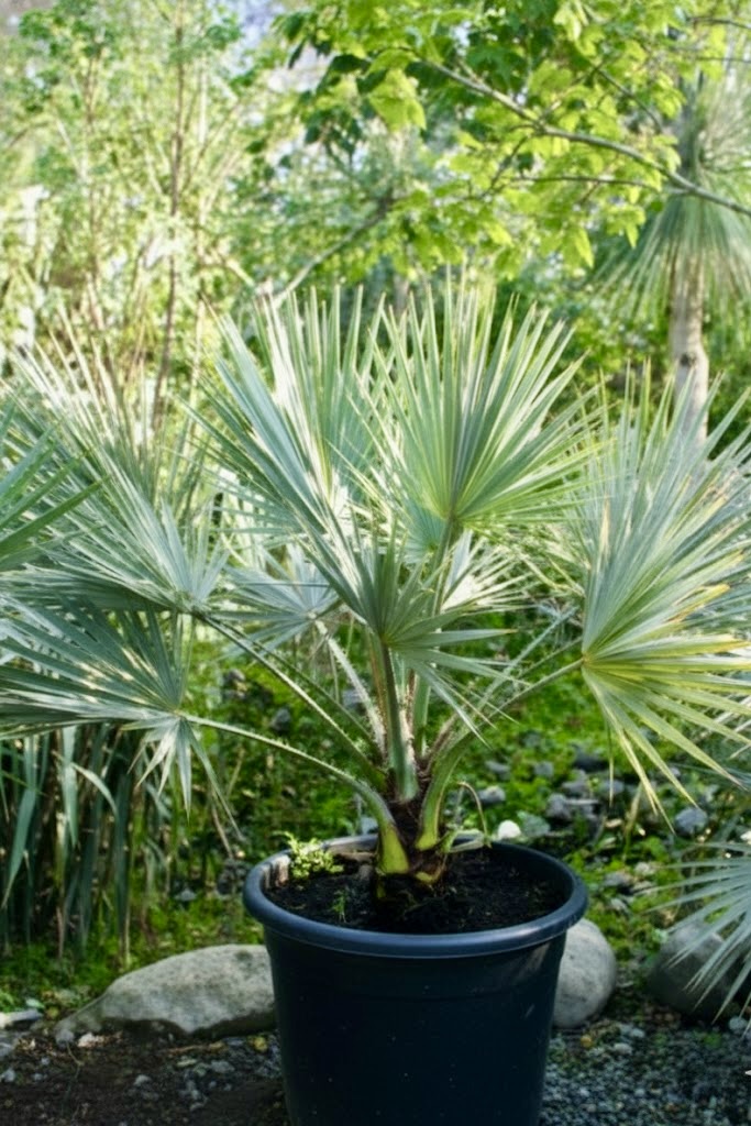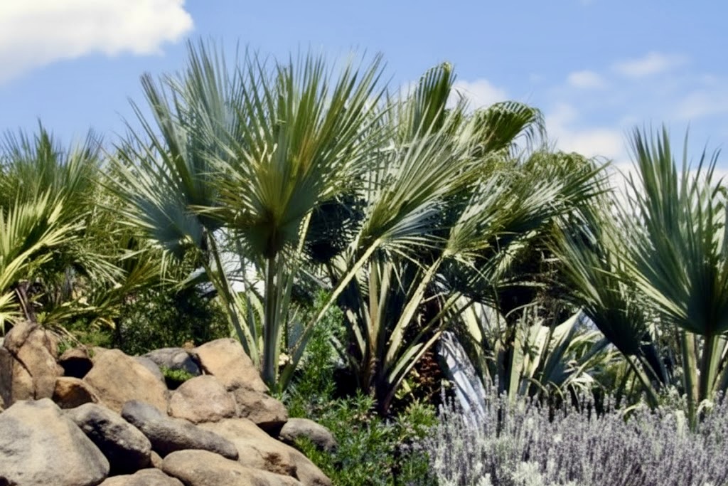 The Blue Palm (Brahea armata) that we introduce today is rapidly gaining popularity due to its striking blue coloration and cold tolerance. Comparable in hardiness to the widely used Washingtonia palms in landscaping, the Blue Palm remains relatively unknown in our country because mass propagation has not yet been established and its slow growth keeps international prices high. Whether used solitarily or in groups, the Blue Palm can function as an intermediate plant along pathways, as a roadside plant, or as a transitional species between low shrubs and taller green palms.