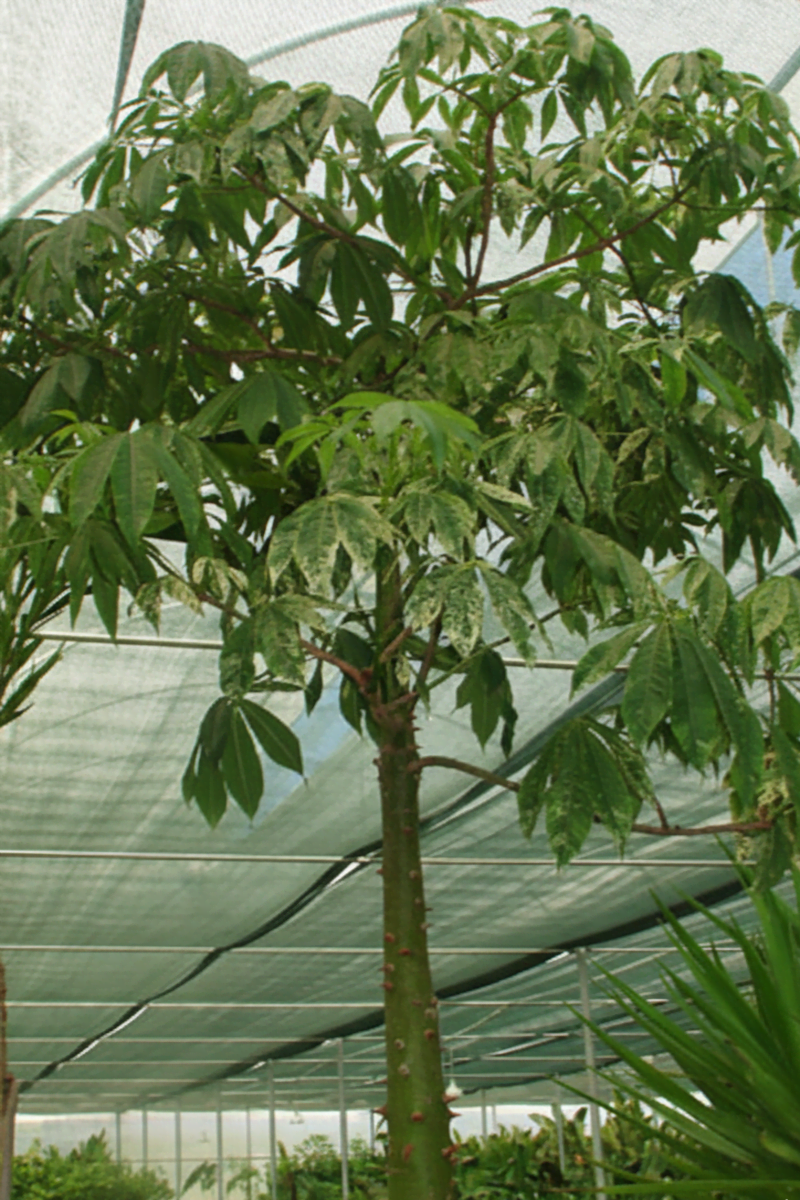 The Silk Floss Tree is native to Brazil and Argentina. Its trunk is covered with prominent thorns, similar to those on a rose stem. The leaves are palmately compound with 4–7 leaflets, and the petioles are long. The seed pods are lined with silky fibers that surround the seeds. In Brazil, these fibers are used to produce stuffing and upholstery material. For this reason, in English the tree is called the “Silk Floss Tree.”