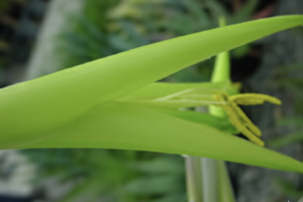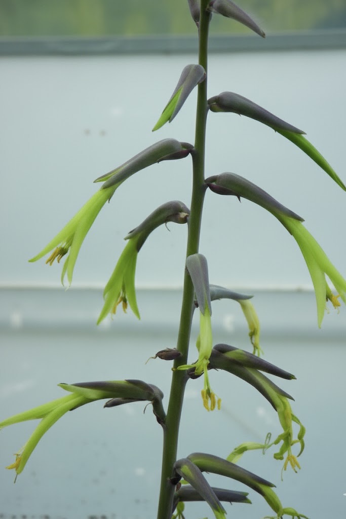 The inflorescence is remarkable: a 1–1.5 m tall spike bears racemose, tubular flowers up to 6–8 cm in length, with a yellowish-green coloration. After seed set, long, elliptical, brown seed capsules remain on the plant for an extended period, contributing to an interesting visual effect.